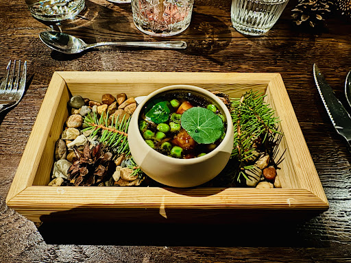 Pääruokana ollut poro oli lihana tietenkin täys kymppi, mutta lisukkeena ollut sieni (tatti) oli aika kova. Jälkkäriä pyydettiin odottamaan tovin, jotta saatiin viinilasit tyhjäksi ja jälkkäri olikin yllätys. Ensin meille tarjoiltiin esijälkkäri, jossa oli koskenkorvapuolukkaa, lunta ja kuusenkerkkää (varmasti kaikkea muutakin siinä oli) mutta tämä annos oli niin hyvin koottu, että parempi nimitys olisi sille suomalaisuuden perusydin lautasella. Aivan fantastista.