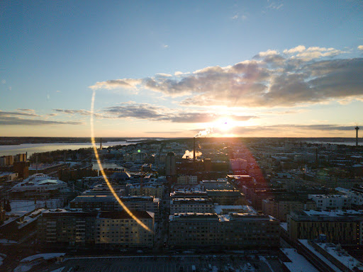 Situated right in the center of Tampere, third biggest town of whole Finland, the cocktail bar occupies the top floor of the highest "skyscraper" (quite small one compared to others around the world, but it sticks out...) and delivers a fantastic 360° view all over Tampere and the surrounding areas. If your lucky enough with the weather and be there while dawn is happening, you might be witness to a fantastic sundown which floods the whole floor with spectacular warm colours, creating a sensationally peaceful environment. One might say this is just the nature of the sun going down, but the architecture and interior design makes the very best use of it and even amplifies the sensation... Other than that it's a very nice place to hang out, chat with friends, colleagues, mates or whoever you happen to be with, have a few drinks (it's a cocktail bar, but they have a big variety of other alcoholic and alcohol-free beverages available...) take in the stunning view and simply enjoy life. Entering the building and taking the elevator to the bar is free of charge, you only pay for what you consume. The staff is absolutely professional in what they do, also very funny and entertaining. And one of the guys was a walking dictionary of Whiskeys from all around the world! Come in and try it out, it...