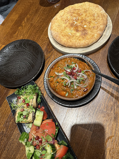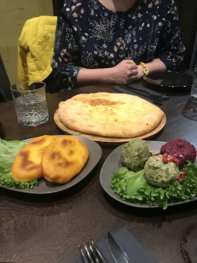 The food is wonderful, the cheese bread, pkhali, and chashashuli were especially delicious. If you order the corn bread, order it with one of the stews: it has a great texture but the flavor is very bland and a little dry to be eating on its own. It would also be nice if grilled items were served on larger platters, though-- the quail's platter was barely bigger than the quail itself and it made it very difficult to get any meat from the bird since there wasn't much room for things to be cut (check out the attached photo). Our waiter waited until we were ready to order before telling us what items they were out of, so we had to take more time to make a new order. After all of our food was brought out, he avoided our table entirely-- it's very hard to do that in Rioni's very small dining room, and I'm not sure why he did so (it was very obvious as well-- he was frequently going to other tables and then turning away so that he couldn't see one of us raising a hand to talk to him). We received our food at around 19:15 and were finished by 19:30 and intending to order dessert, but he "didn't see" or respond to us until after 20, after which the kitchen was closed. That was a baffling detail of the night, but overall Rioni is definitely...