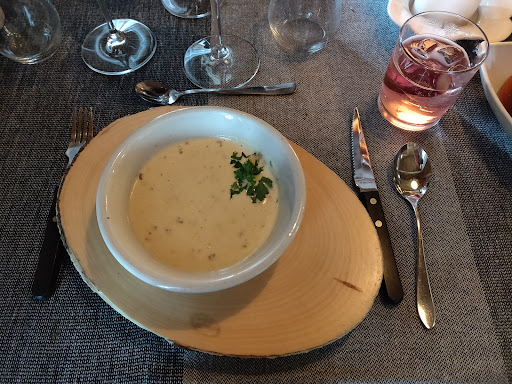 Alkuun vaikutti todella hyvältä. Miellyttävä sisustus, sopivasti porukkaa, ei liikaa lapsia. Otin suositusmenun, juustoporokeitto, pippuripihvi ja creme brulee. Ongelmat alkoivat oikeastaan jo viinisuosituksen kohdalla. Vaikka en itse viineistä juuri tiedä, ei tiennyt kyllä tarjoilijakaan ja suositeltu viini oli yllättäen samaa brändiä mikä oli painettuna tarjoilijan essuun. Ihan ok, mutta ei varmasti parasta juuri tähän ruokaan. Tietynlainen asiantuntemuksen puute oikeastaan laski multa pisteitä. Sain kyllä lasiin enemmän kuin 18cl, mutta ei se tilannetta paikkaa. Juustoinen porokeitto alkuun oli taivaallisen hyvää 5/5. Raparperidrinkit alkuun olivat kanssa oikein passelit.