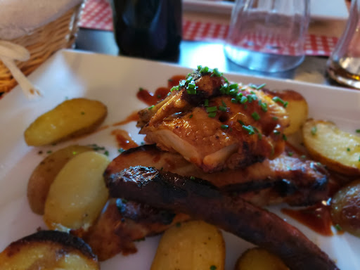 The good: Fast and friendly service, prices are reasonable for the region. The sauce aux poivres was good. The bad: The steak itself was very sinewy and with pockets of tough chewy fat, about half of the steak was not even edible (see picture) and my boyfriend nearly choked trying to eat it. My steak tartare tasted overpoweringly sweet because there was a whole lot of ketchup mixed in, which is to my knowledge not even an ingredient for a steak haché so why even add ketchup? The side salads were very sad, no dressing, half a raw poivron, some cold peas... Cannot recommend and do not understand the recent 4-5 star reviews for this place that made us give this restaurant a...