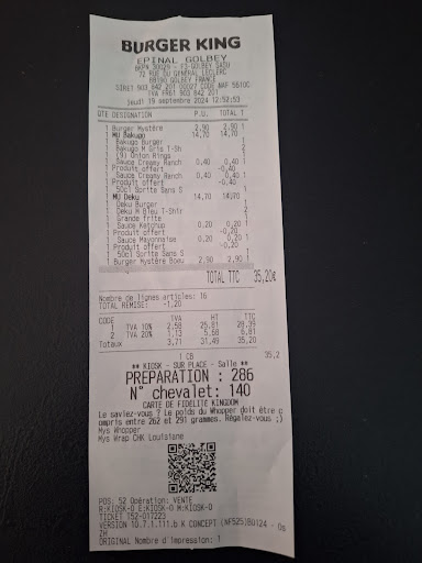 Read moreService plus que déplorable, 2eme fois que je me déplace pour commander à emporter dans l’enseigne de Golbey, commande pas complète et service hautain et dédaigneux quand on veut passer à l’encaissement et qu’on demande à avoir une offre qu’on avait reçu et que nous pouvions pas notifier sur la borne, nous voulions également payer une partie avec une carte ticket restaurant cela ne fonctionnais pas, cela reste pourtant un moyen de paiement non ? Après avoir payer nous attendions la commande, une personne est venu nous voir 10 minutes plus tard pour savoir si on avait reçu cette dernière ? Évidement que non, ah bah oui il ne l’avait pas encore commencer, et pourtant le restaurant était loin d’être bondé bref… Une fois réceptionnée cette dernière évidemment il manquait des choses, encore heureux qu’on avait vérifié avant de rentrer, nous allons donc réclamer notre dû c’est limite si on nous prend pas de haut, excusez nous mais la prochaine fois faite en sorte d’être concentré sur la commande que vous préparer cela évitera sans doute les erreurs, Une chose est sûr cela sera sûrement la dernière fois que je...
