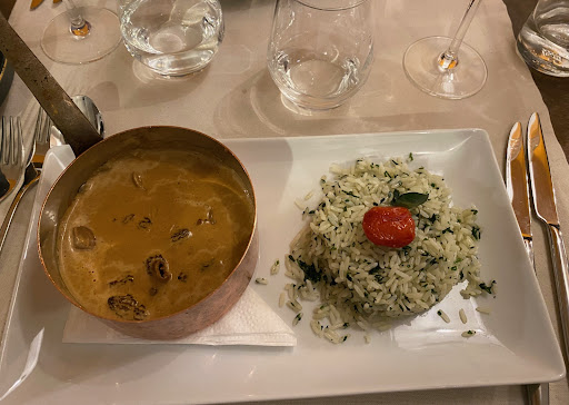 En entrée, risotto de fruits de mer ,délicieux ,il me semble qu’il était accompagné de feuilles de citronnelle (à confirmer) , pour ceux qui n’aiment pas , il suffit de ne pas les manger ! c’est bien vu ! À ma droite ,velouté de céleri qui était tout aussi appétissant .