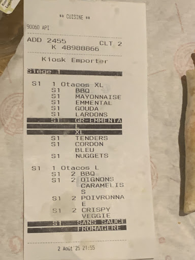 Lorsque nous sommes entrés dans le restaurant, aucun employé n’était présent. Nous nous sommes même posé la question pour savoir s’il y avait vraiment quelqu’un. Au passage de nos commandes, la grande majorité des produits étaient indisponibles (« rupture de stock » suite à une « grande affluence » soi-disant). Pour autant, on ne peut pas dire que le restaurant était bondé et que le personnel était débordé… Pour exemple, plus de la moitié des viandes était en rupture, ce qui est le comble pour un « restaurant » spécialisé dans les tacos où la viande est l’un des ingrédients principaux. Au vu des autres avis, il semble que ce soit quand même un problème plutôt récurrent. En regardant les horaires d’ouverture, nous avions vu que le site fermait à 23h. Nous décidons de manger sur place mais à l’arrivée de nos commandes (aux alentours de 21h), on nous a servi « à emporter » en nous informant qu’il n’était plus possible de manger à l’intérieur afin que l’unique employé puisse faire son ménage. Jusque là, aucun souci, pour ne pas déranger, nous nous installons dehors en terrasse et là encore, on se fait virer. Au final, nous nous sommes retrouvés avec nos tacos, sous la pluie, à 21h30.