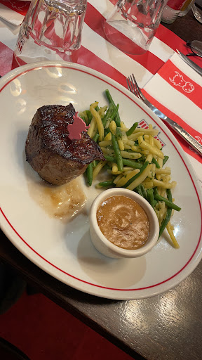 La viande ( entrecote 250 g de 0,2 cm d'épaisseur maximum) et ne pése pas son poids ( guére plus de 160 g ) et est trop grasse et mal cuite . Et çe pour le prix astronomique de 22,90 euros ...... La téte de veau qu'a pris ma femme baignait dans un liquide insipide et n'avait aucun gout ( le peu de légumes étaient congelés ). Les sauces proposées étaient industrielles et sans saveurs.... Une petite salade un peu passée et un demi fromage . Le tout proposé pour un prix exorbitant (67 euros soit + 30% en 3 ans , avec -30% de qualité et de quantité !!!!!! ) .