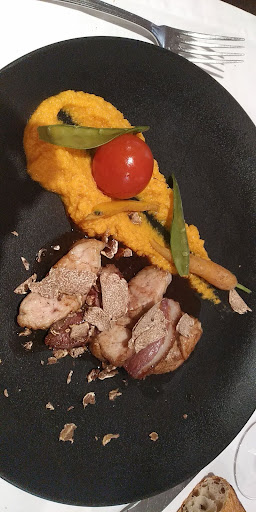 Un bel accueil par le serveur qui doit certainement être le patron. J'avais repéré un ris de veau sur la carte Web, qui n'était pas sur la carte papier. Mais pas grave, le monsieur me dit qu'il peut me le faire... Super content de l'attention. La serveuse également super pro et souriante. Une belle impression. La ou pour moi ce n'est pas à la hauteur, c'est le niveau de cuisine par rapport au prix. 60 euros le menu, il faut que ce soit tip top... Car ça commence à faire du bruit... Foie gras bon, gravlax assez basique pas spécialement de goût. Sur les plats, le ris de veau beaucoup trop cuits, et cette façon d'emincer le ris ne respecte pas à mon sens le produit.... Pour les purées, trop d'épices... On s'égare.... Plateau de fromage pas non plus à la hauteur à mon sens. Pour ce prix on s'attend à autre chose que de la boulette d'avesnes, du roche baron ou du comté 6 mois... C'est trop basique. Les dessert idem... Trop basique je trouve. Je voudrais également revenir sur la carte des vins. Elle est magnifique, mais inabordable. Et quand on se rabat sur les basiques, et bien on est frustré... Un Bourgogne 2021 à 40 euros c'est pas possible... On est le pays du vin... La carte des vins au verre, mis à part la région, pas de millésimes, on est paumé... J'imagine que le HC de nuit était un 2021 ou 2022... Je suis donc mitigé, car c'est un joli restaurant, avec des gens qui sont passionnés, c'est sur... Il n'y a qu'à voir la collection de guides rouge...la trancheuse italiennes la cave entre la salle est la cuisine. C'est top Mais le rapport cuisine prix n'est pour moi pas bon. Rien de personnel, juste une critique que je donne à mon petit niveau pour améliorer...
