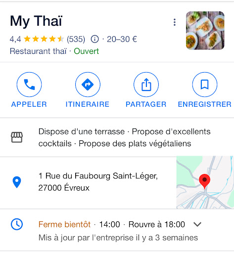 My daughter lives in Thailand so I spend at least 4-6 weeks a year there. I love Thai food but rarely eat it when I am back in the UK or in Europe because it rarely compares with what you can get it Thailand. "My Thai" in Evreux is a notable exception. The meals I have had here over the past three years compare very favorably with my experience in Thailand and, indeed , are better than most. In fact, the food, to my taste, is more like Vietnamese than Thai cuisine, but I am not complaining, it is fresh, tasty, interesting and very well presented. The staff are attentive and friendly, and you can bring you own wine or beer which makes it cheap too. If you can ignore the often crazy negative reviews which usually have nothing to do with the food, you will discover a real gem of a restaurant. Highly recommended. And the wine was delicious too, but then I...