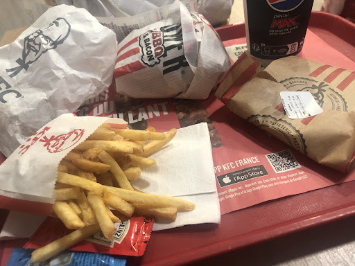 Read moreAucune envie d'y retourner, KFC n'est plus ce qu'il était. Manque d'hygiène total, vous demandez un menu et un Sunday. On ne pose sur le plateau sans couvercle mont Sunday, et en attendant le reste le serveur appelle d'autres numéros et mon Sunday et dépose-la devant les postillons de tout un chacun devant les gens qui tendre la main ou le bras pour récupérer leur plateau ou pour demander des sauces, du sel supplémentaire tout ça devant mon Sunday sans couvercle. Les frites sont froides avec un drôle de goût. Les pilons sont fatigués à croire qu'ils ont été trempé plusieurs fois dans l'huile. Ne parlons même pas de la salade dans le sandwich quasi inexistante et ce qu'il y avait plus que flétri rien à voir avec la chaleur du poulet. Serveuse et serveur se parle votre portion de frites en mains plaisante se gratte la tête, une autre remet en place sa queue de cheval, et sans gêne récupère une portion de frites par le haut donc il y a contact !!! Ecoeurant le temps d'avoir mon menu ma glace était quasiment fondue. Heureusement on me la resservi. Les toilettes ? je ne sais pas si l'humidité qui se trouvait au sol était de l'urine !!! Papier au sol. Pour finir car je ne suis même pas sûr qu'ils feront un effort : La salle est sombre manque de luminosité ou d'éclairage, plutôt bruyante. Cerise sur le gâteau rentre et sort de cuisine moineau et pigeon. Faut le voir pour y croire il faut vraiment avoir fin pour manger de bon cœur. Pour ma part j'ai pas pu finir ma glace et mon menu. Ce...