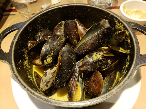 The mussels are ok but it is not all you can eat as advertised. In 2 hours and 15 minutes we were only able to get 3 half sized portions of mussles, with 1 order of room temperature fries. Maybe it's better on a weekend but on a Tuesday night they seemed overwhelmed with about 25% of the restaurant full. The only reason it's not a 1 star review is because the mussles tasted ok even if they were a bit sandy. I would not recommend the all you can eat unless you have 3-4 hours to wait for your food. The fries would have been good if they were warm however the mussels were served hot...