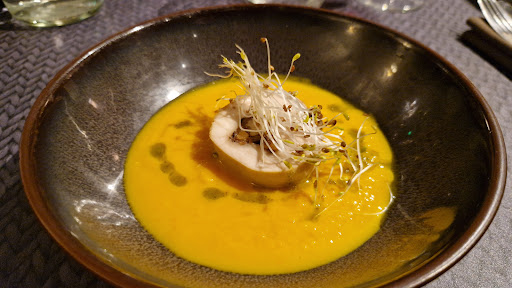 Mercredi 11 Oct, dîner à 4...dans un cadre agréable, chic & sobre...mais c'est à peu près le seul point très positif...pour le reste c'est assez approximatif ! 1/ le serveur refuse que l'on s'installe à une table ronde car elle était dressée pour 5, alors que la salle était vide (2 autres couverts uniquement) et elle le restera jusqu'à notre départ, nous nous installons donc à une table de 4 qui était bancale... 2/ je demande 2 cartes sans prix pour nos invités... cela semblait assez compliqué... mais finalement nous avons 2 "feuilles" sans prix sauf pour un dessert pour lequel le prix n'avait pas été supprimé ! 3/ une serveuse assez peu aimable, en tenue de ville, prend nos commandes d'une façon assez expéditive 4/ les apéritifs sont servis, et à peine 5 mn après... les entrées...là encore un peu expéditif, nous n'avons pu terminer nos verres... 5/ les entrées : "Œuf parfait" trop froid et velouté de châtaignes un peu insipide "Pressé de tête de cochon" sauce gribiche dans laquelle nous n'avons pas trouvé les câpres ou les cornichons.. 6/ les plats "Saumon snacké, tartare d'algues & quinoa, légumes d'automne" pas mauvais mais quand même un peu simplet "Filet de bar, risotto coloré, friture de panais" bonne cuisson du bar qui était bon, mais risotto écœurant et fade "Cocotte de de porc ibérique, tagine de légumes, citron confit" ce plat était bon 7/ les desserts "Entremet chocolat, espuma menthe poivrée" nous avons tous été surpris du dressage de la mousse au chocolat à côté de l'entremet...une mousse marron un peu grumeleuse en vrac dans l'assiette...vraiment pas top en terme de visuel... pas mauvais, sans plus "Poire pochée aux épices douces" ...insipide Un service expéditif, un serveur très aimable mais pas très stylé et une serveuse vraiment pas aimable tout aussi peu stylée... qui attendait les bras croisés, adossée au radiateur que l'on ait "enfin" fini nos plats... Nous attendions mieux, bien sûr les prix ne sont pas ceux d'un restaurant gastronomique mais pas non plus ceux d'un bistrot !!! Trop d'approximations, trop de détails négligés qui font toute la différence... au final assez déceptif, dommage j'aurais vraiment souhaité faire un commentaire...