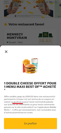 Read moreCe soir je me rends au Drive, passe commande et indique que j'ai une offre promo : On me répond que la manager n'est pas au courant de cette offre. Arrivée au guichet de paiement, je demande à parler avec la manager et lui indique que sur l'application McDo Mennecy, pour tout achat d'un menu maxi best of un double cheese est offert. Cette dame me répond alors qu'elle n'est pas au courant de cette offre et qu'elle ne me l'appliquera donc pas : Offre pourtant bien valable au McDo de Mennecy en passant par le drive (photos jointes). J'essaie alors de trouver moi-même une solution en proposant de passer commande via l'application mais impossible de payer (que ce soit en PayPal ou CB). Un message indiquant qu'une erreur est survenue ne cessait de s'afficher. J'explique alors cela à la manager qui me confirme que comme elle n'est pas au courant de cette offre, elle ne me l'appliquera pas. Cela alors que toutes les preuves de validité de cette offre étaient face à elle.