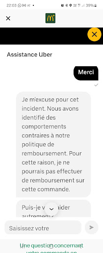 Je fait un retour de ma commande faite via l'appliccation uber, sur laquelle j'ai commandé 2 happy meal et une grande frite;(co mmande numero 0666 caisse 364 #ord le 16 mai 20 a 13h 01 ) Uber fait son tf et me ramène la commande rapidement,proprement; J'ouvre et voila qu'il manque un menu enfant: je vous passe des détails bref je vais a ce mac do pour récupérer ce qu'il manque et j'en crois pas mes oreilles ,si il manque des articles dans la commandes c'est de la faute de Uber ,et si je ne suis pas contente je n'ai qu'a aller ailleurs,et bien sur aucune excuses, ... Et c'est la responsable qui m'a répondu et qui avait fait ma commande: Ils sont incroyable ,2 jours avant il manquait les frites (mais la j'ai eu Vally ,une personne tres gentille ,qui s'est excusé,vraiment sympas en plus;,°Le problème c'est que c'est constamment dans ce mac do qu'il manque des articles; Il ya vraiment un problème d'organisation ,tout le monde touche a tout ce qui fait que ce n'est pas la m^me personne qui fait la commande de A a Z ; Et personne qui vérifie avant que la commande parte;Ou alors cette personne n'est pas au bon poste; Je ne comprend pas ,mais si la responsable préfère conclure par aller ailleurs et qu'ils ne prennent pas leurs responsabilités préférant accuser les absents, bah ce n'est pas prêt de s'arranger malheureusement. Quel dommage et quel manque de professionnalisme. Et croyez moi je ne suis pas la seule! Faite quelque chose...