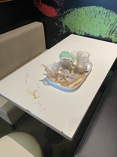 Nous avons commandé des Ice Tea (comme à notre habitude), et nous avons été surpris de constater que nos boisson avaient une couleur opaque. Nous en avons fait part aux employés qui nous ont dit « les boissons ici sont sans sucre, c’est pour ça que ça a cette couleur là, mais maintenant que vous le dites, c’est vrai que la couleur est bizarre »