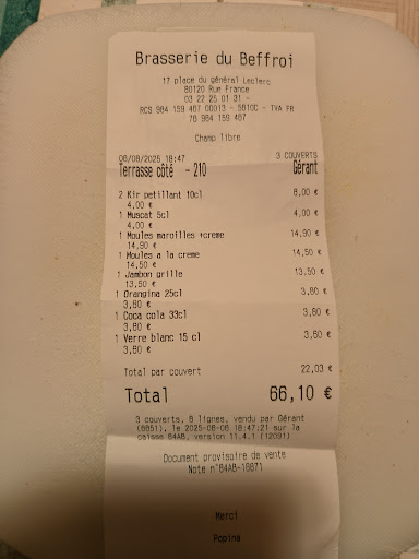 Nous avons dîné ce mercredi 6 août 2025 Quelle déception... Arrivé à 18 heures en début de service, nous prenons l'apéro. Déjà le muscat, un demi petit verre y compris les glacons, bu en 2 fois..... Mais soit .... Nous avions également demandé en plus des boissons, une carafe d'eau, on aurait peut être dû demander avec des verres ... Arrivent les moules et le jambon grillé. Directement je vois les frites qui sont à moitiés cuites. Je demande donc de les cuire mieux. Après je me rends compte qu'il manque à table le sel, la mayonnaise, les cuillères et les rinces doigts .... A l'ouverture de la casserole de moules, celles ci ne semblent pas dégager un fumet et une chaleur habituelle.... En effet, je prends facilement la casserole avec le plat de la main, celle ci est à peine chaude. Je goûte les moules qui sont tièdes, et que ce soit celles à la crème ou au Maroilles, quasiment aucun goût.... Pour le jambon grillé, une petite tranche de jambon lard très fine et une sauce à l'échalote sans vraiment de goût.... La brasserie du Beffroi, nous y allons depuis au moins 15 ans, nous avons même la carte de fidélité avec l'ancien patron. Depuis lors la carte du menu s'est appauvrie, mais dit on qu'il vaut mieux une petite carte mais de qualité..... L'année passée la direction avait changé, et nous avions mangé correctement, cette année c'est l'endroit où nous avons le plus mal mangé depuis que nous venons dans la région. Changement de cuistot, je ne sais, mais une déception gustative...