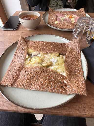 One of the best creperies I've been to since a long time. I love their selection of toppings you can get on your crêpe. Friendly staff Nice and big space, also tables for larger groups. We were a group of 10 with a small dog and a baby. Salty meal crêpes are...