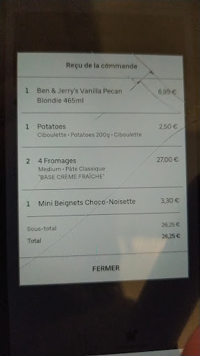 Covid oblige, je reçois mon repas par le biais de la livraison 25 minutes plus tard. Le timing est parfait. Première surprise, je m'aperçois que le livreur à oublié mon dessert. Il fait demi-tour et revient au bout de 5 minutes. L' erreur est humaine. Cependant, nouvelle suprise, après avoir insisté sur la base crème fraîche, nous recevons nos 2 pizzas base sauce tomate. Ma conjointe appelle, le responsable refuse d'admettre l'erreur commise sur notre commande. D'un air hautain, Il nous demande de relire notre reçus, cherchant à couper court notre conversation téléphonique, il propose d'échanger nos pizzas dans 01h30 ! Il voulait peut être nous donner les restes ? 🤔