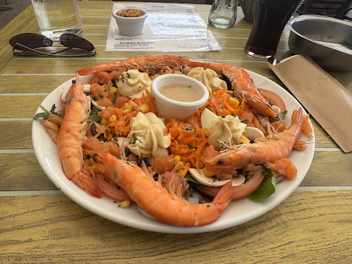 Read moreTheir welcoming was pretty fine. They accomodated us to the place with a nice view on the bay (please note that there is veranda in-between: so forget to have an open vue degagee on the coast). The low tide is here every now and then, so you will not see waterfronts but rather a kind of sabled mud disappearing at the horizon. This is why I prefer the picture of Tripadvisor, giving you a stable viewpoint on the front building.||||The menu is printed on a fixed set of pages giving the impression their strong points are the "moules", which is however hard to accept if you live in Belgium as we do.||The conversation is sometimes surrealistic: ||Here an example: "Tonight I do not feel to eat much as I have some fever" (customer)||Response from the waitress: "C'est bien", meaning that it is a good thing (maybe you can read her wise statement so that having fever will warm you, no need to drink alcohol, eat less and save your money). ||||If you like Eugene Ionesco's books, therefore this is the right place to go .||The other guests wanted some wine. Interestingly enough the list of wine does not display the year of the bottles anywhere (do not try to conceive to ask difficult and out-the-blue questions about the "cepage" or the "cuvee") but a generic denomination: Chablis , or Riesling, that is all in all , as Tomistic wisdom taught us and pre-socratic school said that the being is always the same and never changes.||Customer asks: may I ask you the year of the wine ?||(waitress raises eyebrowns and with a grim comes back to you and points you the finger to a point of the bottle, which is extremely helpful unless you have some eyesight problem).||The salad with shrimps is another strong point. Green is the coulour and fresh. Tomatoes are, as usual in North Europe, the element of colour only. You will not try to look snobish to eat tomatoes having the Dutch taste, not really ? One special point of this gastronomic salad is that there is not dressing on it: looking around the room you do not see any visible sign of the presence of oil (any kind of oil) and vinegare. Of course the waitress already believes that you do not need to ask such things. This means this restaurant can be a typical example of a new gastronomic salad of green vegetables in their original taste.||The dessert is another key-moment. ||Do you like creme chantilly ? Good, as you will anyhow find in all the desserts they propose you. As dishes are huge, the creme chantilly would cover the surface appropriately and accordingly .||The whole evening the background music (at low tones of sounds, sincerely not disturbing us) would be Abba and other greatest hits of the Seventies you cannot find anywhere else.||For such a gastrononomic menu, you can count a budget of around 33 euro per person, water included.||(the wise waitress would prove you her wisdom until the end: she would not come to bother you to greet you and she will therefore nicely prevent you to even thinking of giving her...