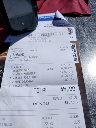 Read moreI had the €14.90 menu. 5 good sized prawns to start with mayonnaise dip pot and bread. Moules marinières & frites which were really poor quality and so small they looked like they should still be growing the frites were fine. The desert was thrown onto the table a small tub of ice cream. The man who served me was a bit strange also asking personal questions and making personal remarks. I had a half bottle of Muscadet and a bottle of sparkling water and a coffee which came to just over €30 euros in total. I think they are working on volume and price here rather...