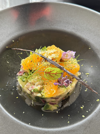 C’est une véritable expérience gastronomique. À chaque étape – entrée, plat, dessert – trois propositions sont disponibles, auxquelles s’ajoutent un plat et une entrée du jour. La présentation est soignée, servie dans une vaisselle élégante qui met parfaitement les mets en valeur. Les portions sont généreuses, les produits d’une grande fraîcheur, et chaque assiette est agrémentée d’épices et de fleurs comestibles qui apportent originalité et raffinement. Chaque bouchée est une découverte, avec des saveurs subtilement relevées, parfois inspirées de la cuisine asiatique, étonnamment, car le chef n’a ni voyagé ni travaillé en Asie selon ce que nous avons appris.