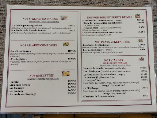 Read moreNous sommes très bien accueillis à notre arrivée. La qualité de service durant le repas était impeccable. En revanche à la fin du repas, au moment du dessert, le service s'est trouvé un tant soit peu bâclé (les premiers desserts arrivent alors que certains n'ont même pas encore été commandés et le serveur nous demande s'il peut déjà encaisser). Bref nous avions l'impression de devoir faire vite. Concernant les plats c'était bon mais avec un rapport qualité prix moyen. Ceux-ci sont relativement onéreux pour ce qu'il y avait dans les assiettes. Ces derniers s'apparentaient davantage à ceux servis dans des cantines ou snacks de plage (très simplet, dont un est arrivé vraiment sur un plateau de cantine qui m'a été laissé à table). J'ai pris la ficelle de la Baie de Somme, présentée sur la carte comme une crêpe fourré. À son arrivée devant moi, j'avoue avoir un peu cherché la crêpe ! J'avais plus l'impression d'avoir un gratin aux champignons avec deux-trois moules qui se battaient entre elles. Un peu cher à 18,95€ ! Mon grand a pris le burger frites à 18,95€. Un peu surpris également car évoque un burger...
