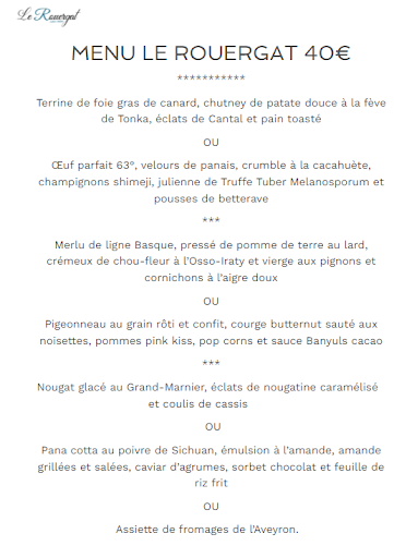 De retour au Rouergat pour tester le menu surprise à 75 € et nous n avons franchement as été déçus, pas moins de 6 plats, mais avec des portions suffisamment grandes pour bien déguster les saveurs mais sans trop vu le nombre afin de ne pas finir avec une indigestion. A noter que la carte n est pas la même qu il y a 2 mois et vu le travail nécessaire pour confectionner de nouveaux plats nous tenions à...