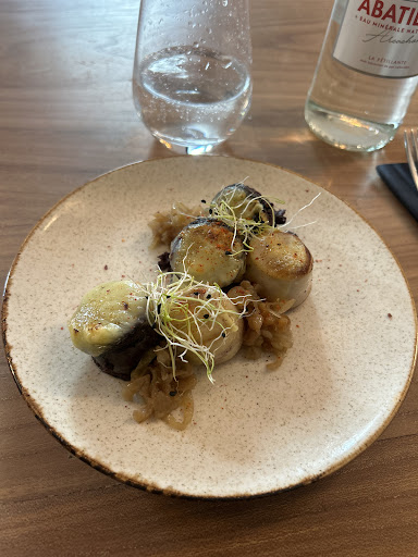 Nous sommes venu un peu au hazard au départ, avec de la famille. C’ était super ! Petit endroit, pas stressant du tout, pas préssé. Apparement une épicerie ouverte par une conserverie. Nous étions avec une grande tante, qui a pas de caractère, et a tout de suite choisi une côte de boeuf, et a commencé à demander de mettre des choses en plus dans le plât ! Des échalottes confites par dessus s’ il vous plaît ! Le chef absolument adorable a absolument aprécié cette demande spontanée, nous a préparé ça, c’ était délicieux, très très très bonne qualité de dressage, finition, d’ attention, d’ équilibre. Juste une bonne dose de cuisine avec amour. La technique du chef se cache derrière la qualité, pas trop dans l’ excès, et les apparences. Les entrées aussi délicieuses. Je ne sais pas comment on fait griller du poulpe comme ça tout autour de la tentacule…