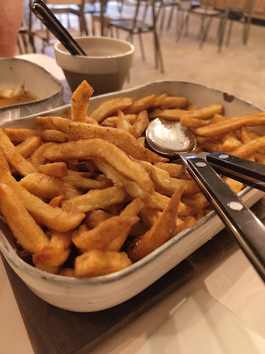 La lumière est trop tamisée pour un aussi grand espace, ce qui fait vite mal aux yeux et fatigue. Se serait chouette qu'il est plus de sauce proposé avec les frites ! Pour les frites se serait trop chouette de varier des fois les formes, comme un mélange de frites (meilleurs, plus beaux et singulier). Conseil à bien prendre s'il vous plaît ☺️