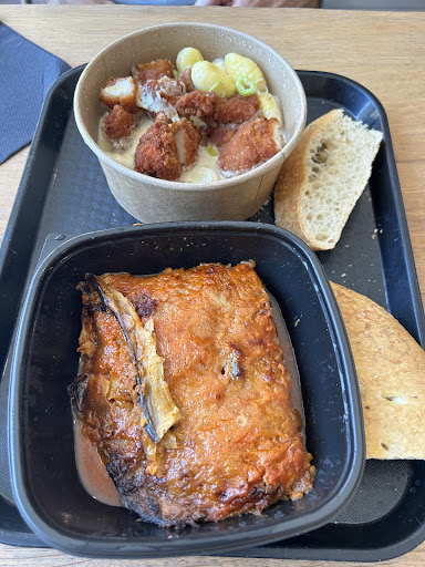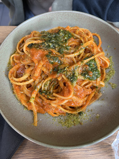 Italian food, quick and tasty lunch. Great attentive staffs and friendly owner. Clean toilets. Ambience is nice to sit and enjoy food with friends or even with kids. Lasagna was delicious and good portion 18€. It came with salads. My daughter asked to have kid’s menu. Pasta tomato sauce for 15€. We asked but they said it’s a big portion. Anyway in my opinion It’s bit too expensive for it. It’s not worth the price. Will come back and try other food but this time I will make sure to ask for the cost if order outside...