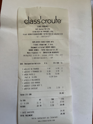 Enfin, j’ai des choses écrites sur le ticket de caisse, que je n’ai pas pris dans mon repas.