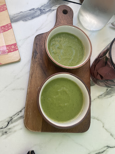 Amuse-bouches : Nous avons commencé avec un velouté amuse-bouche de concombre, basilic, oignon et ail. Ce velouté était très bon et parfaitement équilibré. La présentation, sur une petite planche en bois, ajoutait une touche rustique et conviviale.