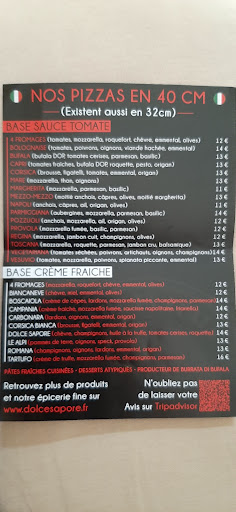 Read morePremière expérience chez Dolce Sapore qui m'avait été vivement recommandé par ma Kiné. J'ai décidé de tester leurs pizzas à emporter. L'accueil est convenable, le jeune homme qui prend les commandes plutôt sympathique. Le temps d'attente un poil trop long mais bon, on n'avait pas commandé donc ça peut peut-être s'expliquer. Il n'était pas possible d'avoir des pizzas en 40cm de diamètre donc on nous a proposé des pizzas de 32cm. OK pas de souci... Sauf que lorsque nous avons ouvert les boîtes, les pizzas de 32cm semblaient avoir rétrécie !!! Pour la première fois de ma vie, j'ai mesuré le diamètre des pizzas pour vérifier tant la différence de taille ne pouvait que sauter aux yeux!!! Résultat: 27cm... Soit 5cm de moins! Une variation de 2, 3 cm je veux bien, mais 5cm sur les 2 pizzas en plus, c'est un peu abusé! Surtout que le prix par contre lui n'a pas rétrécie en conséquence, 20€ pour 2 mini pizzas (prix non annoncé sur la carte) alors que 2 pizzas de 40cm aurait dû coûter 24€! Ça fait un peu cher! Les pizzas ont été prises en début de soirée donc, il devait y avoir encore suffisamment de pate pour les faire au bon diamètre! Par contre, les pizzas étaient plutôt bonnes, pas grasse, pas sèche... bonnes saveurs... Bien dommage, cette histoire de taille qui nous a un peu refroidi... peut-être que l'on retentera tout de même l'expérience... La personne qui a fait les pizzas avait certainement malencontreusement oublié ses lunettes ce soir là, et donc ce problème était sûrement exceptionel ! Par contre, cette fois-ci j'apporterai mon mètre pour vérifier...