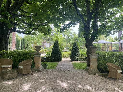 "La Table du Pigonnet" was a find, literally. We had wanted to lunch in Aix-En-Provence on our way to Paris. Among other things, it is a university town. We used Google maps to identify a good restaurant but then found that where we liked the restaurant, parking was elusive. Nobody answered the phone. Most frustrating and we were conscious of the 12:00-2:00 or 3:00 window available for lunch. Finally, Google came up with "Le Pigonnet' and we found parking nearby.* We walked down the driveway to the entrance and asked if they were still serving lunch and could they accommodate us. They set a table for us in the most exquisite of settings: a formal, walled garden with an alley of beautifully tailored chestnut trees, and walkways perfumed by roses and the sound of water from fountains, both formal and simple. There were columnar Italian Cyprus and I think I spotted a birch or aspen with its delicate fluttering leaves, and olive trees. Fragrant herbs, mostly rosemary, lavender and thyme grew in profusion. Under foot were blocks of a local stone or gravel. But wait, you ask , what about the lunch?! It too was exquisite: I had Magret de Canard to start which was beautifully presented with thin slices of vegetables shaped and crispy, and asparagus in season, followed by a Dorade in a pepper sauce and slices of crunchy chorizo, and then a desert of strawberry souffle, flanked by a ball of lemon sorbet and a pot of "crème anglaise" - with guidance to make a passage in the soufflé, pour in the crème anglaise and let the flavors meld. Amazing flavor! Kevin had Magret de Canard as a first course and pronounced it delicious. Small flavorful and intriguing appetizers were served before lunch and a bite of hazelnut cake and a jellied fruit square were served with coffee. The service was gracious and unhurried and we left at 3:00 feeling we had had the best lunch in France. We still feel this way several weeks later. Our thanks to the chef and to the attentive staff! A "trouvaille."I do recommend getting a reservation. *Parking is...