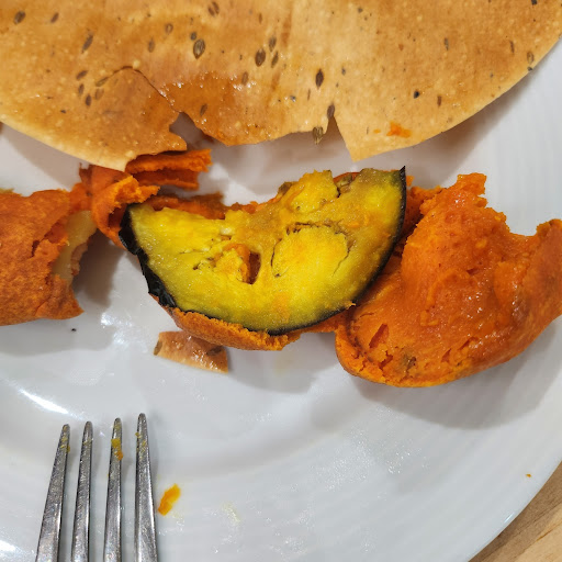 6- Arrivent les entrées: quelle horreur. Voir les photos. La pâte, à peine cuite, fait 90% de "l'objet". J'appelle ça "objet" car je ne peux pas appeler ça de la nourriture. Une rondelle de patate et une rondelle d'aubergine, dans une pâte rougeâtre indescriptible, sans goût. Absolumment ignoble. Mais ce n'est pas fini.