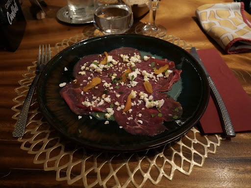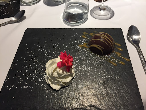 On était pas loin du bleu avec un cœur froid, ce qui peut ne pas être très dérangeant pour certains mais le gras n'étaient absolument pas cuits et donc immangeables, avec une texture absolument désagréable même le couper était difficile. Autre point négatif : les tournedos sont arrivés ficelés, ce que je peux tout à fait comprendre pour la cuisson, mais la ficelle n’a rien à faire dans mon assiette. Dans une atmosphère de nuit aussi tamisée, je me suis retrouvé plusieurs fois avec de la ficelle dans la bouche, ce qui gâche encore une fois toute l’expérience de ce plat, qui est toutefois bon avec des accompagnements et un jus maîtrisés. Mais comme je l’ai dit, dans une enseigne de ce standing, ce genre de détail n’a pas sa place.