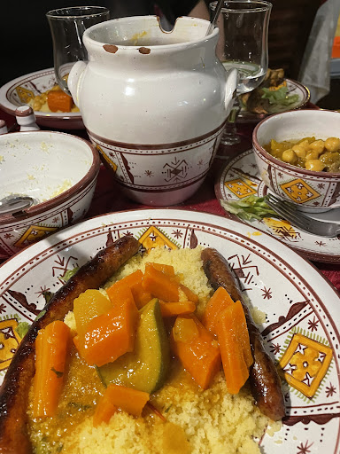 Couscous servi pour mes deux amis dans une petite assiette une avec deux merguez pas cuite lâautre avec un morceau dâagneau pas gros avec quelques pois chiches dans cette assiette (on sâest demandĂ© ce que faisait ces pois chiches dans cette petite assiette) arrive les lĂ©gumes tout juste pour deux avec la sauce trĂšs piquante comme nous sommes arrivĂ©s tard on se demande si on nâa pas mangĂ© des restes de bouillons pour que ce soit aussi piquant Tajine aucun goĂ»t le jus Ă©tait de lâeau soit disant aux pruneaux il y avait de tout dedans 2 abricots 2 pruneaux des raisins secs 2 amandes non grillĂ©es soit disant royal 3 minuscules boulettes 1 merguez pas cuite que je nâai pas mangĂ© 1 petit morceau de poulet avec os et idem pour lâagneau moi par contre il a fallut que je demande du piment Lorsque nous avons demandĂ© du rosĂ© ils ne servaient pas dâalcool je pense quâĂ la rĂ©servation on aurait pu nous le dire nous sommes en France ils nâont pas Ă nous imposer leurs façons de faire sâils nous lâavaient dit Ă la rĂ©servation on aurait pas Ă©tĂ© chez eux DONC RESTAURANT Ă...