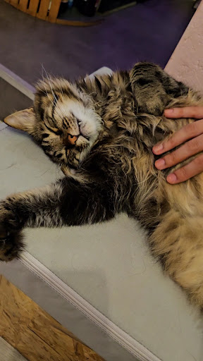 Points positifs : Ambiance sympa lorsqu'il n'y a pas trop de monde (ce qui était notre cas ce mercredi midi) Les règles quant au respect des chats sont pour moi parfaites et ils semblent à leur aise et heureux Le goût de refrechat était bien dosé, le thé glacé un peu plus subtil Le seguin avec un supplément bacon était très bon La personne qui nous a accueillis était souriante et très agréable (mais elle était en cuisine ensuite, dommage)