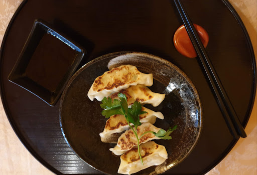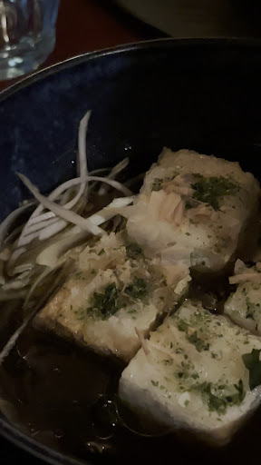 J'opte généralement pour une variété de petits plats. Le tofu agedashi (doufu), un tofu ferme saupoudré, généralement, de fécule de pomme de terre ou de maïs et légèrement frit, est un délice avec son bouillon savoureux. J'adore aussi la salade fraîche avec ses algues wakamé sucrées et ses flocons de varech savoureux, ses morceaux de tofu et ses légumes frais, assaisonnés d'une vinaigrette traditionnelle, je suppose, le wafu, à base d'huile de sésame, de sauce soja, de vinaigre de riz et de graines de sésame. J'adore aussi les gyozas au poulet et aux légumes, des « raviolis » servis avec leur sauce delicate. Deux succulents sushis au saumon parfaits pour terminer le repas.