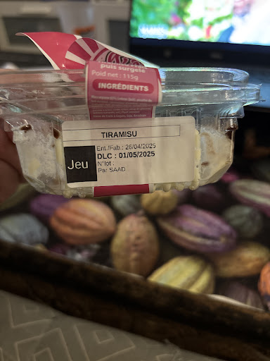 Nous avons pris des desserts: un milkshake à la fraise qui était apparement très bon (d’après mon chéri 😉) et un tiramisu nutella que j’ai beaucoup aimé aussi ! J’aurai adoré que les boudoirs soient trempés dans le café (mais les desserts sont préparés par une autre entreprise donc ils n’y peuvent rien 🙂), j’ai aussi pu constater avec grand plaisir que la mascarpone n’avait pas été coupée à la chantilly ce qui est pour moi un très bon point. Un autre petit bémol pour le tiramisu: la DLC était dépassée de la veille (voir photo), même si le tiramisu était encore très frais et était d’ailleurs très bon, attention 😉