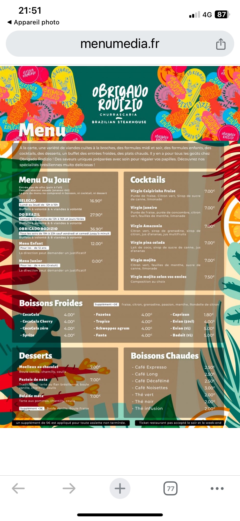 Read moreVraiment un restaurant à fuir , déjà pour commencer le buffet froid salades tomate pois chiches en plus ce jour là elles étaient pimenté à fond immangeable,ensuite le tour des viandes ,même pas le temps de goûter une viande qu'une autre vient et c'est des morceaux vraiment minuscule on avait une pince à viande pour 14 personnes alors qu'il y'avais des couples qui avaient une pince chacun , les serveurs sont pressés,il yen a un qui est venue m'enlever un couteau comme sa il m'a dit vous en avez deux alors déjà c'est pas moi qui ai dressé la table et en plus il y'avais ma fille à a côté de moi bref ils ne sont passées qu'une seule fois pour eux l'essentiel c'est d'avoir coché toutes les cases c tout ce qu'il comptait et pour finir le dessert toujours le même ananas alors qu'il y ait un menu à scanner et il est apparu la carte des desserts avec des desserts à la pomme des petits gâteaux portugais mais non alors on paye 40 euros pour manger des tomates cerises et des pauvres morceaux de viandes avec comme dessert de l'ananas bref très très très très déçu en plus les serveurs sont pas réactif les pois chiches étaient imbibé de piment mais vraiment immangeable,c'est pas pour autant qu'ils ont enlevé le plat breefff je ne reviendrai plus jamais .