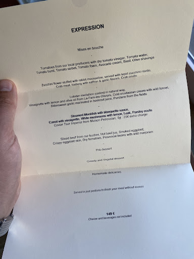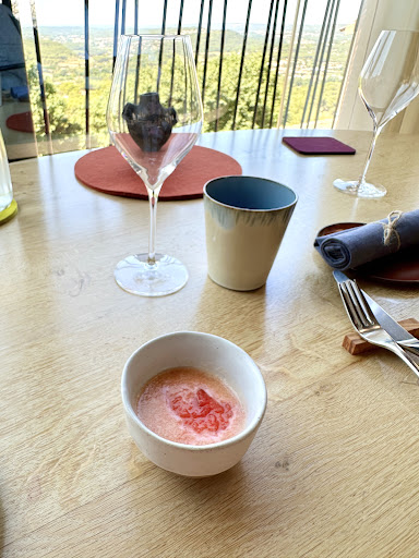 What an idyllic venue perched high in this gorgeous village in Ventabren. You are greeted with spectacular views of a verdant Provençal countryside amidst the serene atmosphere in the well-thought-out minimalist-designed restaurant. You are offered the choice of 4 (blind) tasting menus, ranging from 81€ (for 4 courses) to 149€ (for 8 courses). Vegan and vegetarian menus are also available. We started ours with an amuse-bouche of a refreshing elixir of melon gazpacho, followed by a tomato salad in different textures and a superb tomato sorbet (while my husband had watermelon with smoked aubergine purée), Maigre (fish) for main course, choux topped with peach and a peach espuma and petits fours. Top-notch cooking by the chef patron, Chef Dan Bassoudo, creating magic using top quality fresh produce. Excellent service by the staff (who spoke English), attentive, courteous and described the food well. We would love to go back one evening when they open the glass doors (which are concertinaed to one side).