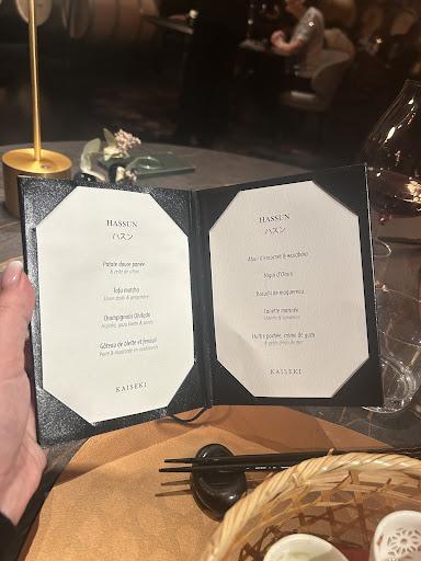 Brasserie K is the more casual restaurant to its sister and more exclusive Kaiseki (located just next door). The atmosphere is dark, yet warm with some interesting art; includive a pink flamingo feather covered helicopter (don't ask me...I have no idea why). The staff is excellent; very attentive and prompt. The menu selection is somewhat limited but everything we ordered was excellent. Even the cost, which you'd expect to be extremely high, was very reasonable for what we ordered...less than 200 Euro for 2 appetizers, 2 main courses, 2 desserts with coffee and 3 cocktails.