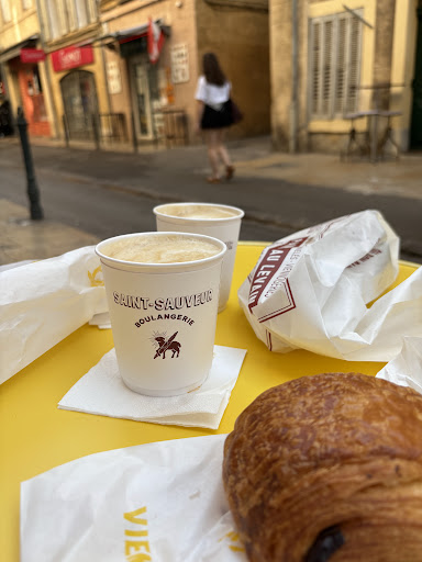 Let me set the scene: you're from the United States and are here in Aix for a month on a study abroad. You miss home. All you want are strawberries and friendly people. You survive your first three weeks in the heat and lack of air conditioning and ice water. People speak a language you barely know, buildings are hot and full of people, and ice is as warm as cookies right out of an oven. Only good part is its automatically filtered. One day after class, you see the yellow and white exterior and yellow and blue woven seats. You walk in and BAM your life is forever changed. In your broken French, you say you'd like a tomato and mozzarella focaccia and your friend orders a tarte fraise. The sweetest, most delightful women take your order. You know you're in for a treat. How could you not when two lovely women help you?! You walk outside back into the heat. Luckily, perched in the shade, are two yellow and blue woven chairs and a yellow table. You sit down, glad that your ginger complexion will not bare another sunburn. You eat your make shift pizza in awe of the flavors melting in your mouth. Then you try your friends tart. Never in your life have you been so in awe. No, disbelief. You never knew a pastry could be so delectable. The flakiness of the crust, sweetness of the custard, and freshness of the strawberries fill your American taste buds with wonder and amazement. This, this you realize, is love! You finish your pizza and dream about your lunch for the hours to come. We've made our way in Aix; we have found our place! The next day, and for most days in your last week and a half, you are greeted with the yellow and white sign and lovely staff. Each day you pay your measly euros for the treat that is the experience ar Saint Sauveur Boulangerie. You are forever changed by that strawberry tart. Your life will never be the same and for that, you...