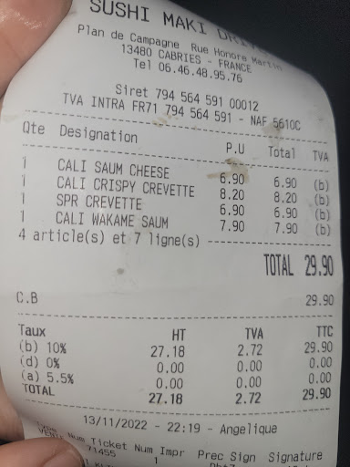 Cliente depuis des années et aujourd'hui quelle déception......je prends toujours la même commande et la 30% d'augmentation. Certes la vie et les matières premieres ont augmentés mais il ne faut pas abuser. Le lot de 10 sushis n'existe plus mais on ne me le dit pas au moment de ma commande par téléphone. Facture de 95€ pour 3 la prochaine fois je vais au resto pour ce prix et je me fait servir. Je donne ma carte de fidélité et la un seul tampon. Avant c'était un tampon par tranche de 15 euros, c'est ce qu'on m'a toujours fait. Une fois arrivé à la maison pas de baguette pas de wasabi pas de gingembre et pas de coupelle pour la sauce soja.... Je leur ai téléphoné pour leur signaler leur erreur.... OK me parle de multiples changements de propriétaires mais aucune réponse convenable.... je n'irai plus jamais. Sur plan de campagne il y a kyo sushi et enjoy sushi à bouc bel air. Je privilégierai désormais ces deux enseignes. Sushi maki drive à fuir c'est du...