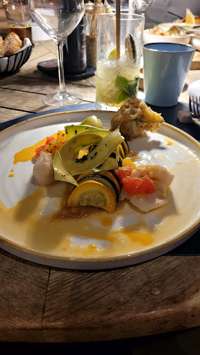 Côté assiette c'est pire : le Saint Pierre nous a été servi légèrement trop cuit avec des courgettes à l'eau mal assaisonnées, le tout présenté de manière tout aussi fade . Les quantités étaient ridicules comparativement au prix (44 euros l'assiette). Nous avons eu 2 morceaux ridicules de poissons (photo jointe : cherchez le poisson ?!).