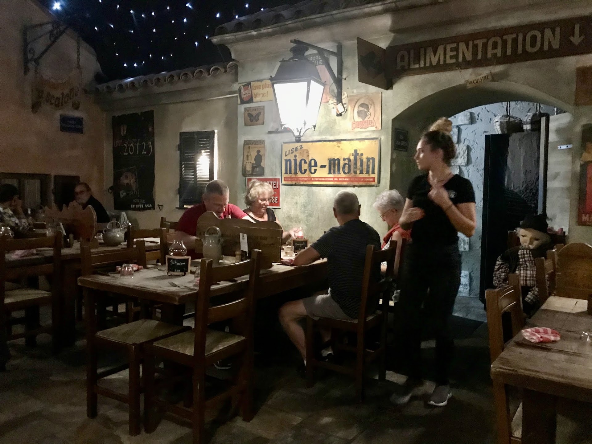 Read moreAn interesting restaurant. "The village in the city" is the theme. The decor captures the spirit of an older age in Corsica, complete with a village well – a touch of kitsch, but it works. The ceiling, a starry night. The service was attentive - in stark contrast to what some other reviewers have posted. The fare was a good representation of Corsican food: a relatively inexpensive set menu (~30€ p.p.); we started with some local charcuterie, then a stuffed zucchini, followed by a robust wild boar stew (my partner had the liver option, loved it). Some local Corsican cheese and very crusty bread. Want some water? - you are given a jug to fill at the village well. (we found the well useful to wash the utensils between savoury and sweet courses -- we were told that using the same silverware for all courses was part of the village experience, so we elected to wash them at the well, in keeping with that spirit!) The wine on offer was an unremarkable local red, (but we admit that the second bottle was better than the first – I think!) The restaurant does exactly what it sets out to do, to give you a village dining experience. We'd return, probably with a larger group than a couple, it is an experience to be shared. Recommended. Tip: Bring cash - no...