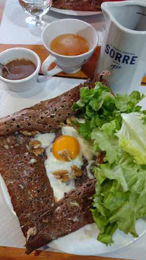 This is basically the only dedicated crêperie around the whole village. The menu contains a wide choice of traditional galettes of "crêpe bretonne" type made from "blé noir" (sarrasin) with all kinds of garnish as a main dish. Obviously, there are choices for a dessert from a list of "crêp sucre". The prices are correct. They have some draft beer and and many other drinks. But I would recommend to order an artisanal cider to accompany your meal. I would give all five stars but the place is missing some...