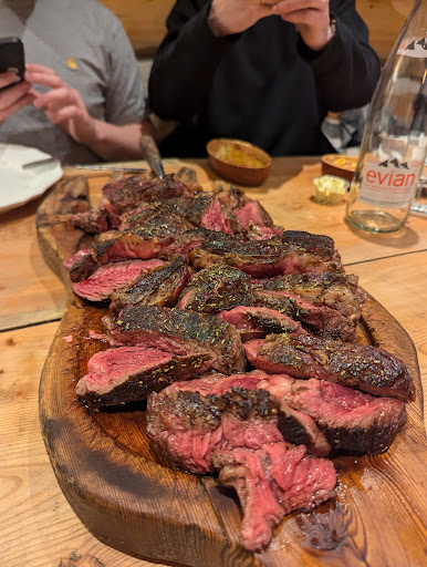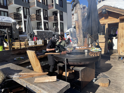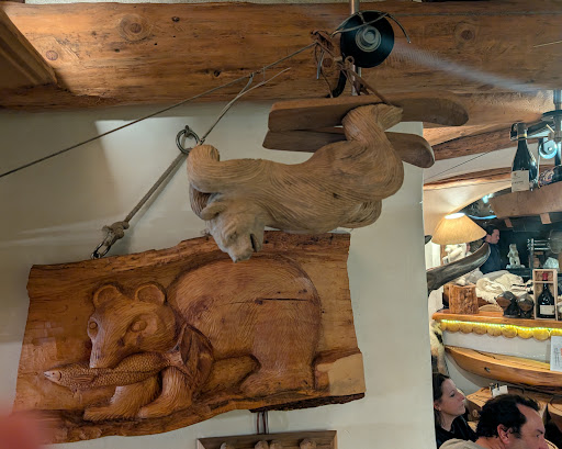 Read moreQuite an interesting bar/shop since you see the carved bears out front. It had a really large outdoor area with quite a few seats inside too. The decor inside is very interesting, almost like a winder wonderland bear cave with plenty of furs strewn on wooden furniture. It was easy to notice after heading down close to the base of the Tufs chair. The menu has quite a few options including BBQ meats, cooked in the outdoor grill. We ended up sharing a plate of the wings and the sausages. The sausages had options of normal or spicy and we were able to get a mix plate of both. The spicy wasn't that spicy though. The dishes were nice but it was quite expensive, almost 20 euros for 4 sausages. It was served with potatoes and salad. What was really good was their chocolat viennois. The Chantilly had the right amount of sweetness to make the chocolate sweet and creamy. The chocolate chaund itself had a nice chocolately flavour. They also were bringing trays of desserts for people to pick from but it didn't happen for us. We were seated on the far side of the outdoor area so it took a while to get the attention of the waiters to get the bill. Nice place but quite expensive as you can get plat de jour deals for the same price. It was an interesting experience though, especially going inside the restaurant. They also had a small shop on...
