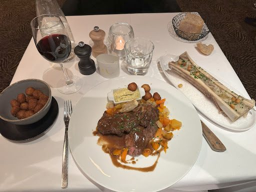 The meat was wrongly cut with the grain in the wrong direction, full of tendons and hard as an old shoe sole. The vegetables were overcooked and slimy. The bone with marrow tasted only of slime and grease. The red wine was quite bland and not on par with what we got in other restaurants in a glass.