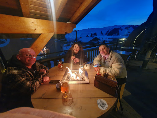 L’intérieur du restaurant est chaleureux et convivial. Il y’a également une grande terrasse et un coin pelouse qui donnent sur les pistes. La vue est magnifique. On y voit la Pierramanta par beau temps. Il y’a également des chaises longues sur l’herbe pour prendre un verre au soleil. On vous proposera même une couverture si vous avez un peu froid. Cette gentille attention est très appréciable.
