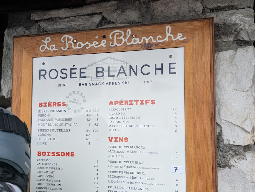 "The White Rose" Great pub with great atmosphere! I've visited this pub many times over the years with my first visit being back in 2009. We always visit at around 4 - 5pm after snowboarding down to la daille from the infamous La Folie Douce. The tree lined runs down to the pub are great fun, enhanced by the fact that everyone is usually in the 'party mood' having spent the last few hours in 'Folie" The pub has a warm cosy feel inside and a spacious terrace outside. The latter often having live music or a DJ spinning an eclectic mix of cool, funky beats! The staff are always friendly and approachable and often contribute to the lively atmosphere. Another plus point is that the free bus service that takes you back to Val d isere / Le Fornet is just outside the pub with buses leaving every few minutes. Just what the doctor ordered after a great day on the mountain. (Ive never eaten here so not...